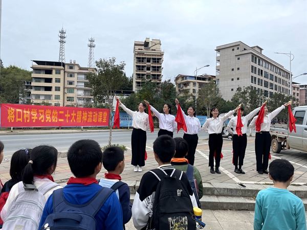 活動中,“巾幗·紅”宣講隊隊員們走上舞臺,精神抖擻地敲響竹板,用押韻通俗的唱詞、生動形象的表演,向觀眾宣傳黨的二十大精神,贏得陣陣掌聲。 “我們選擇了快板這種通俗易懂的形式,精心編排了音樂群口快板《貫徹落實二十大 振興鄉村正當時》,讓黨的二十大精神隨著快板聲入耳入心。”將口鎮黨委宣傳委員陳雯介紹,這段快板雖只有200余字,但在成稿過程中進行了多次修改,既接地氣又有內涵。 抑揚頓挫的快板節奏,通俗易懂的快板詞,快板宣講“聲”入人心,現場觀眾聽得認真、記得深刻,形成了濃厚的學習黨的二十大精神氛圍。