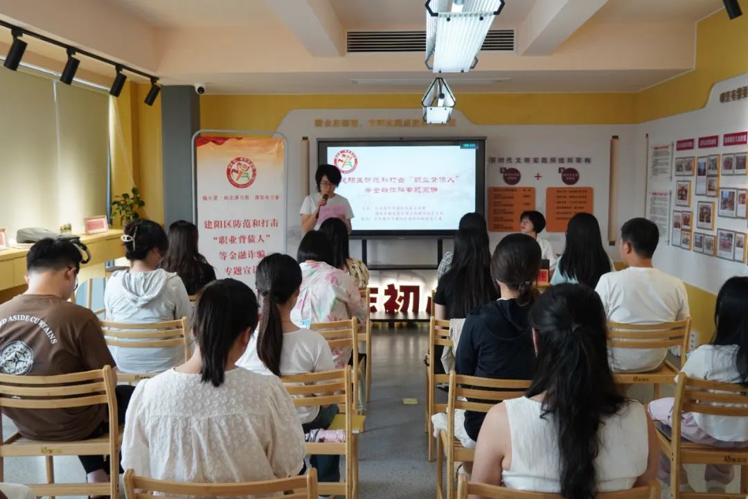 7月31日下午,中共南平市建陽區委宣傳部、建陽金融監管支局、建陽區崇陽街道黨工委在崇陽書吧聯合舉辦“防范‘職業背債人’”金融詐騙專題宣講活動,由中國建設銀行建陽支行副行長游麗萍進行專題宣講。崇陽街道干部代表、各社區代表及群眾代表等參加。