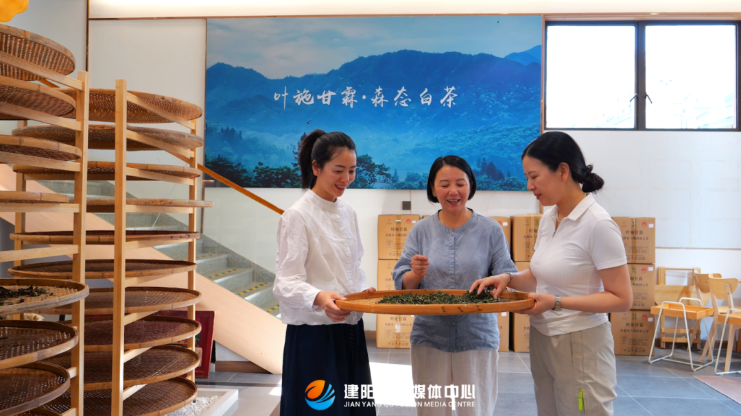 建陽區葉施甘霖茶業有限公司總經理葉素娟:“當我們茶廠在村里形成規模以后,也吸引了部分的青年人返鄉來一起做茶。因為他們回來也能得到一份可觀的收入,讓大家都能夠通過一片葉子富了一方百姓,讓百姓的收入增加了,大家也覺得生活更有奔頭了,越來越高興。” 受姐姐感召,原本在浙江寧波某民辦學校任教的葉素蘭,于2019年選擇停薪留職,回到建陽。她借助互聯網,積極宣傳家鄉的山水之美,推廣建陽小白茶的品牌故事。