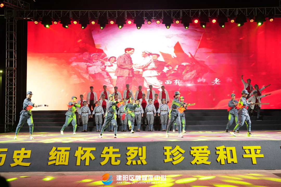 建陽青松合唱團團長劉恩明:“我們帶來了紅歌聯唱《彈起我心愛的土琵琶》《大刀進行曲》,還有《毛主席話兒記心上》,最后一首是《軍民大生產》。今天的幸福生活來之不易,希望我們的年輕人記住國恥,努力工作,為我們的國家貢獻力量。” 本場活動以“銘記歷史、緬懷先烈、珍愛和平、開創未來”為主題,精心設置了《苦難吶喊》《烽火抗戰》《赤子情懷》《時代回響》四個篇章,通過小組唱、舞蹈、詩朗誦、歌舞情景表演、合唱、宣講等藝術形式再現閩北抗戰歷史,緬懷先烈、致敬英雄,弘揚抗戰精神。
