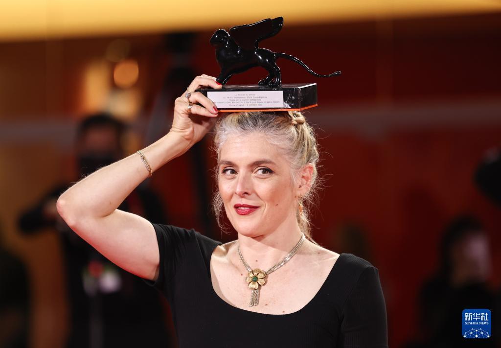 9月6日,在意大利威尼斯,最佳劇本獎(jiǎng)獲得者、電影《執(zhí)筆》導(dǎo)演瓦萊麗·唐澤利與獎(jiǎng)杯合影。 第82屆威尼斯國(guó)際電影節(jié)6日晚在意大利水城威尼斯的利多島落下帷幕。 新華社記者 李京 攝 |