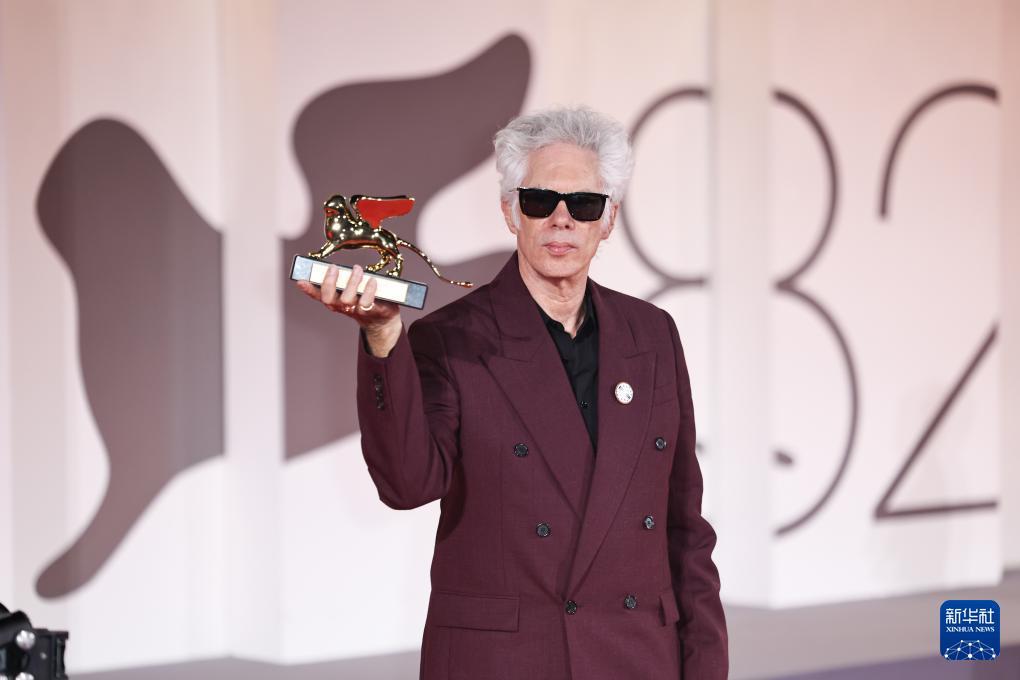 9月6日,在意大利威尼斯,最佳影片金獅獎(jiǎng)《父母姐弟》的導(dǎo)演吉姆·雅穆施與獎(jiǎng)杯合影。 第82屆威尼斯國(guó)際電影節(jié)6日晚在意大利水城威尼斯的利多島落下帷幕。 新華社記者 李京 攝