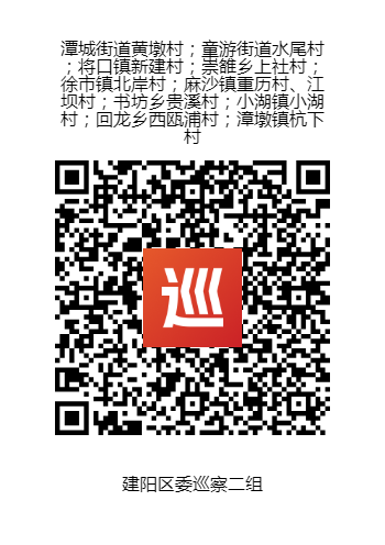 根據《中國共產黨巡視工作條例》、中共中央辦公廳《關于市縣黨委建立巡察制度的意見》以及中央和省委、市委、區委的部署要求,經區委巡察工作領導小組同意,從9月中旬開始,區委巡察組對潭城街道黃墩村等11個村開展巡察“回頭看”,巡察時間30天左右。 區委巡察二組 被巡察單位:潭城街道黃墩村、童游街道水尾村、將口鎮新建村、崇雒鄉上社村、徐市鎮北岸村、麻沙鎮重歷村和江壩村、書坊鄉貴溪村、小湖鎮小湖村、回龍鄉西甌浦村、漳墩鎮杭下村。 組 長:羅衛國 副組長:陳寶峰 聯系電話:17759951338(08:00-18:00) 郵政信箱:南平市A024號郵政信箱 舉報信箱:南平市建陽區童游街道富林小區320-1幢門口右側 舉報二維碼: