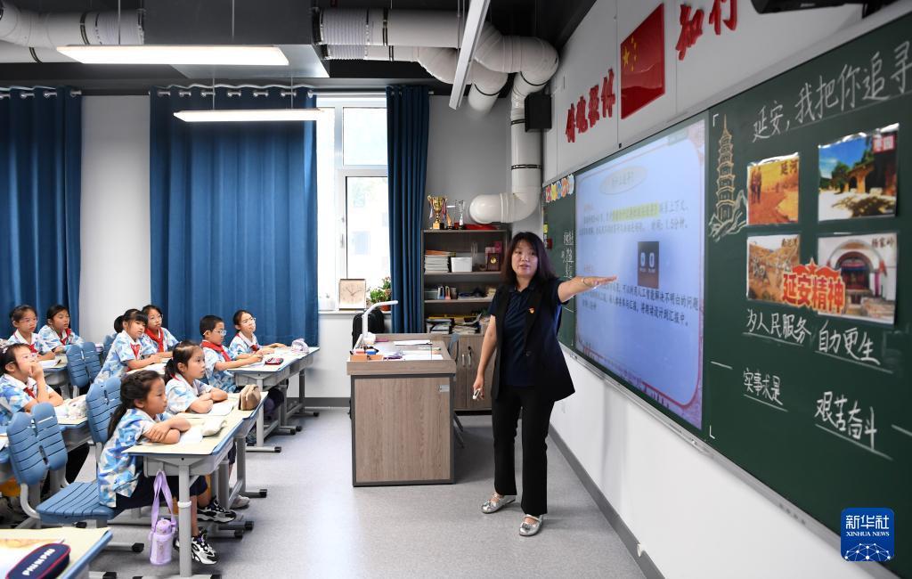 9月24日,老師為北京市第二十中學附屬育鷹小學學生教授國防教育基礎課《延安,我把你追尋》。 9月24日,“AI賦能強動力 國防教育育新人——數智時代國防教育創新實踐交流研討活動”在北京市第二十中學附屬育鷹小學舉行,本次活動旨在落實“人工智能+教育”與2025年“全民國防教育月”活動要求,通過人工智能和國防教育現場課等形式,展示人工智能技術在教育尤其是國防教育中的創新和應用。 新華社記者 馬寧 攝