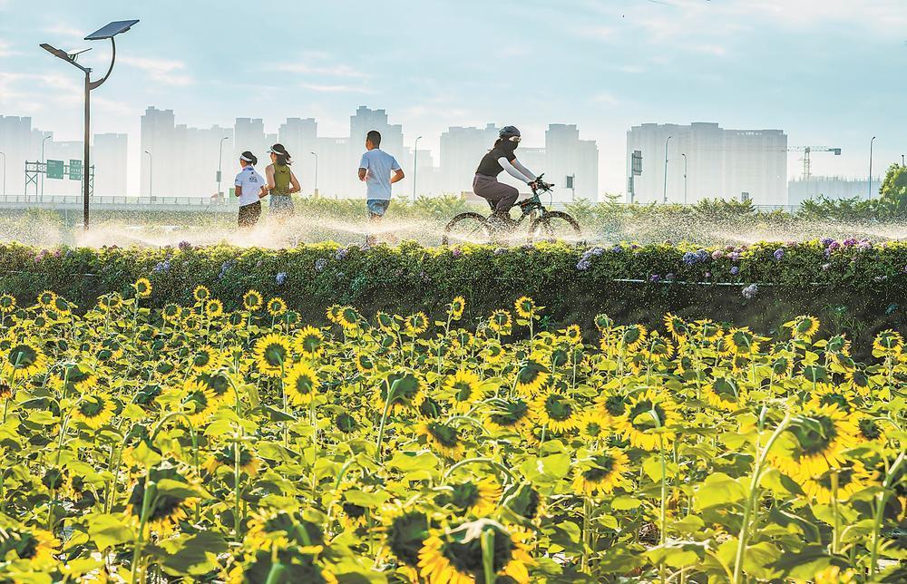 圖為18日,市民游客在向日葵花田間運動游玩。